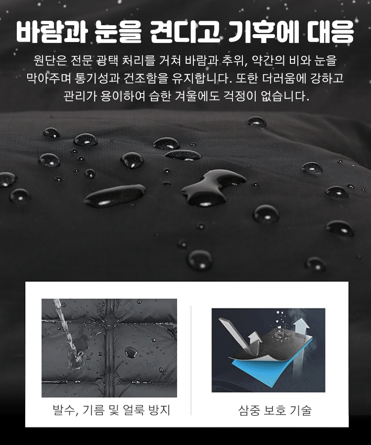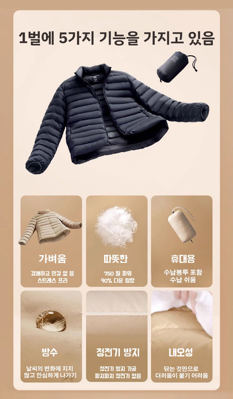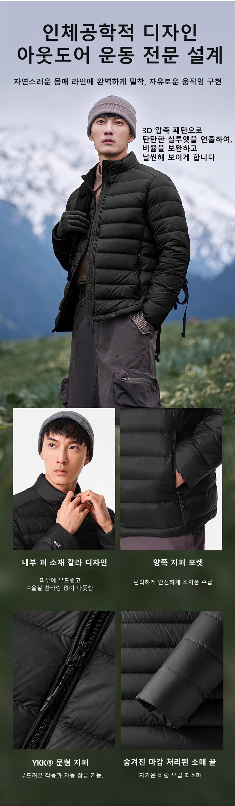 엄선된 오리털, 국제 최고 수준의 필파워. 독일 특허 원단, 방풍 방수